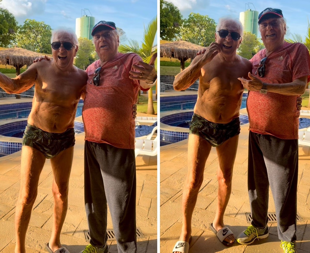 “180 anos juntos de TV brasileira. Batendo um papo nesse fim de tarde. Visita do meu amigo”, escreveu Carlos Alberto de Nóbrega na legenda do post onde aparece de sunga, na piscina do condomínio.