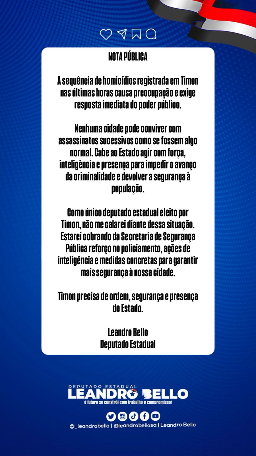 Ao final da nota, Leandro Bello foi enfático ao afirmar que Timon precisa de ordem, segurança e da presença efetiva do Estado, deixando claro que continuará utilizando o seu mandato para pressionar por ações que garantam o direito básico da população de viver sem medo.