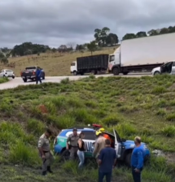 Um acidente envolvendo uma viatura da Polícia Militar e um carro particular foi registrado na manhã desta terça-feira (4) na GO-070, entre o retorno da Vila América e o Lago Luz de Freitas, em Inhumas, região metropolitana de Goiânia. Com o impacto da batida, o veículo da PM caiu em uma vala às margens da rodovia.